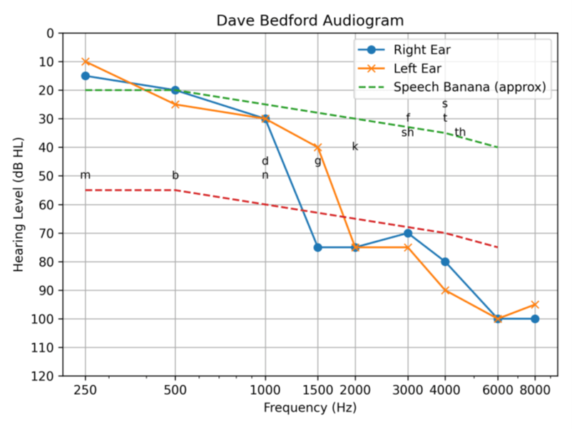 Mine however, descends and then starts to rapidly deteriorate once we start hitting the higher frequencies, meaning they need to be amplified by a level of around 60db+. This drop begins in the middle of the “speech banana”: a range where consonant sounds required to understand speech reside.